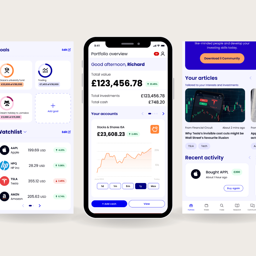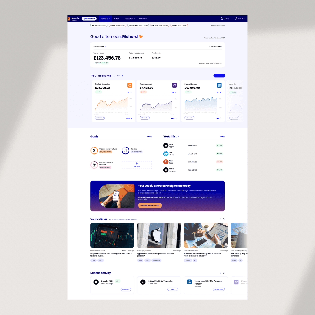 This eight-month intern project explored how personalisation could increase engagement across the Interactive Investor website and app. I led user research, design, and prototyping for our solutions which was a new personalised dashboard experience, and 'Investor Insights', a data-driven feature inspired by “Spotify Wrapped” for investments. The final solutions were fully prototyped and presented to the executive board, including the CEO.
