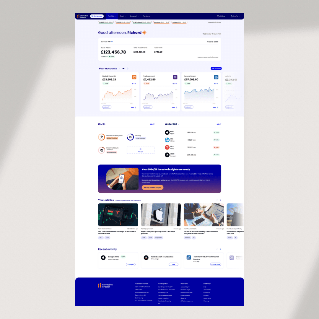 This eight-month intern project explored how personalisation could increase engagement across the interactive investor website and app. I led user research, design, and prototyping for our solutions which were a new personalised dashboard experience, and 'Investor Insights', a data-driven feature inspired by “Spotify Wrapped” for investments. The final solutions were fully prototyped and presented to the executive board, including the CEO.